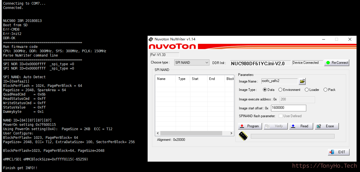 This board use the SPINand as the main storage for bootloader, kernel and rootfs, and NUC official has a GUI utility for burnning through USB.