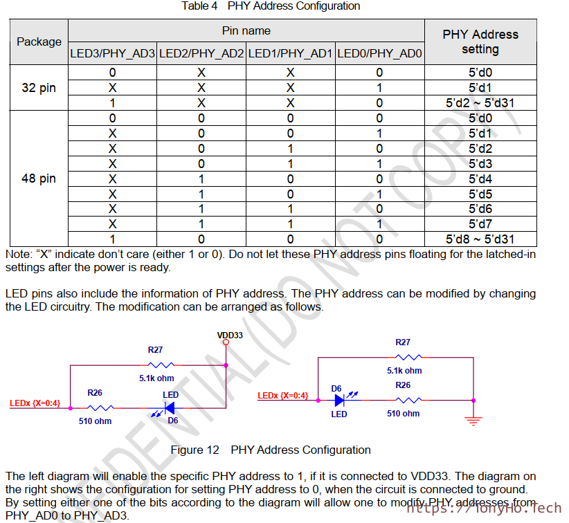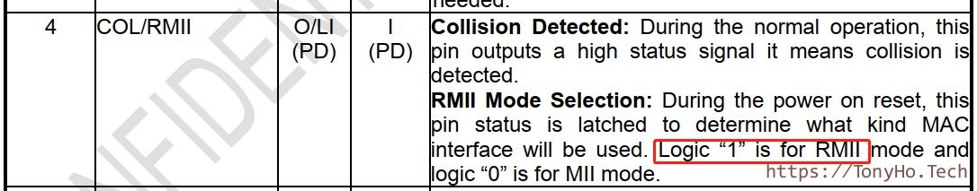 According to the Datasheet, RMII mode is required, so the Pin4 is pull-up